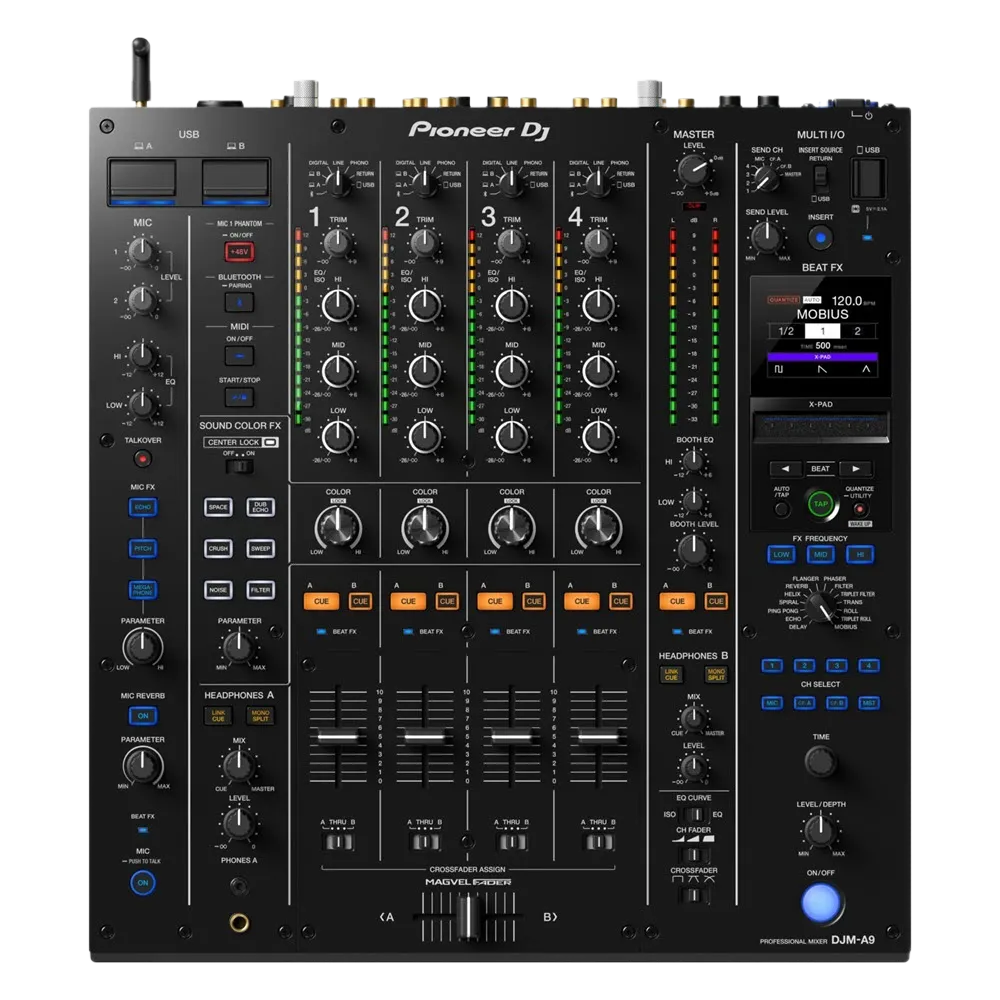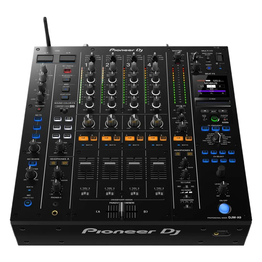We’ve coupled this with the Pioneer DJM-A9 (the upgraded version of the legendary DJM-900NXS2) because it’s got 32-bit converters across the board, super-slick channel faders, and those glorious new Beat FX and Sound Color FX with the Center Lock so you don’t accidentally nuke your mix when you’re mid-performance.