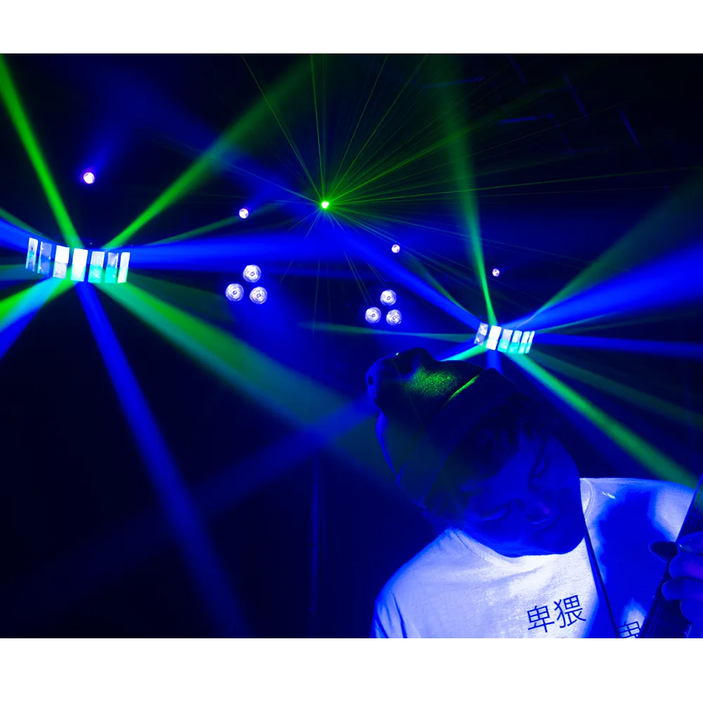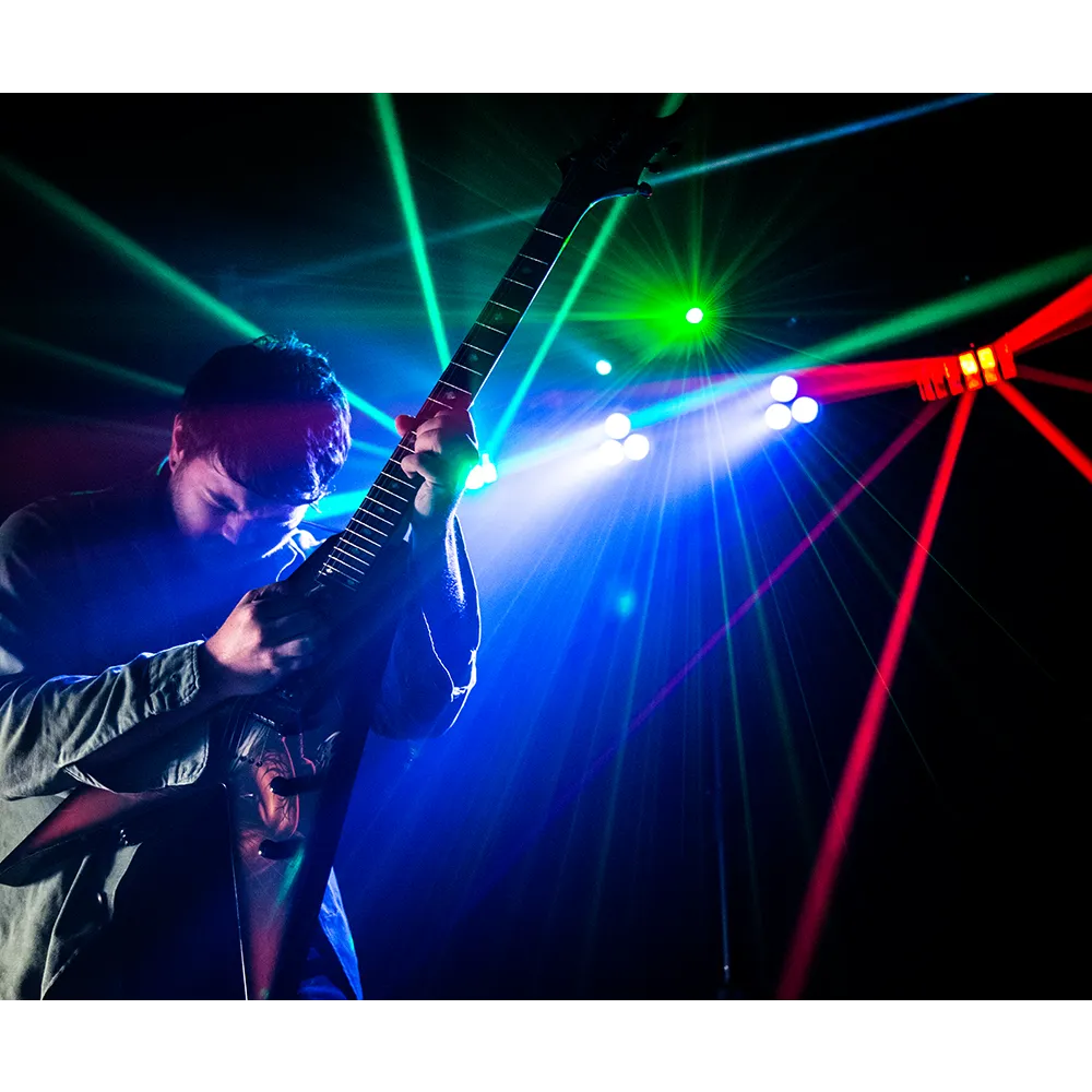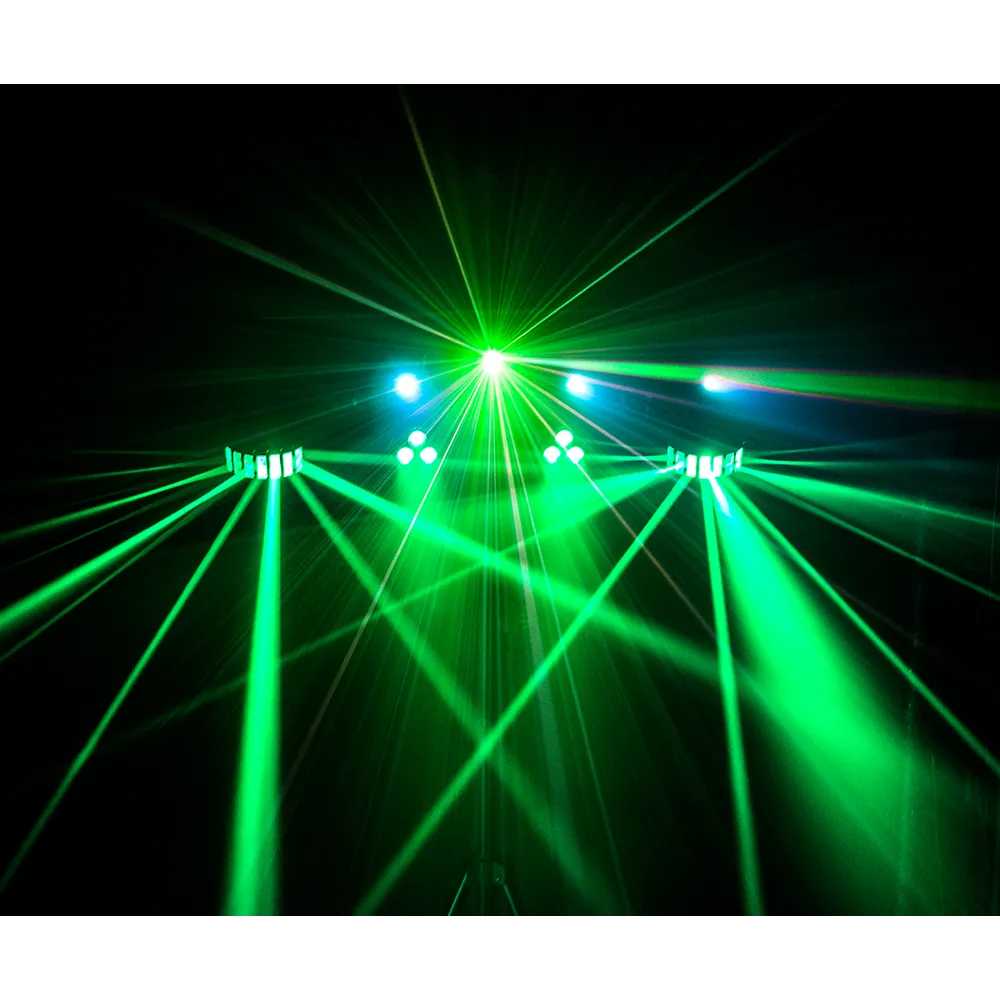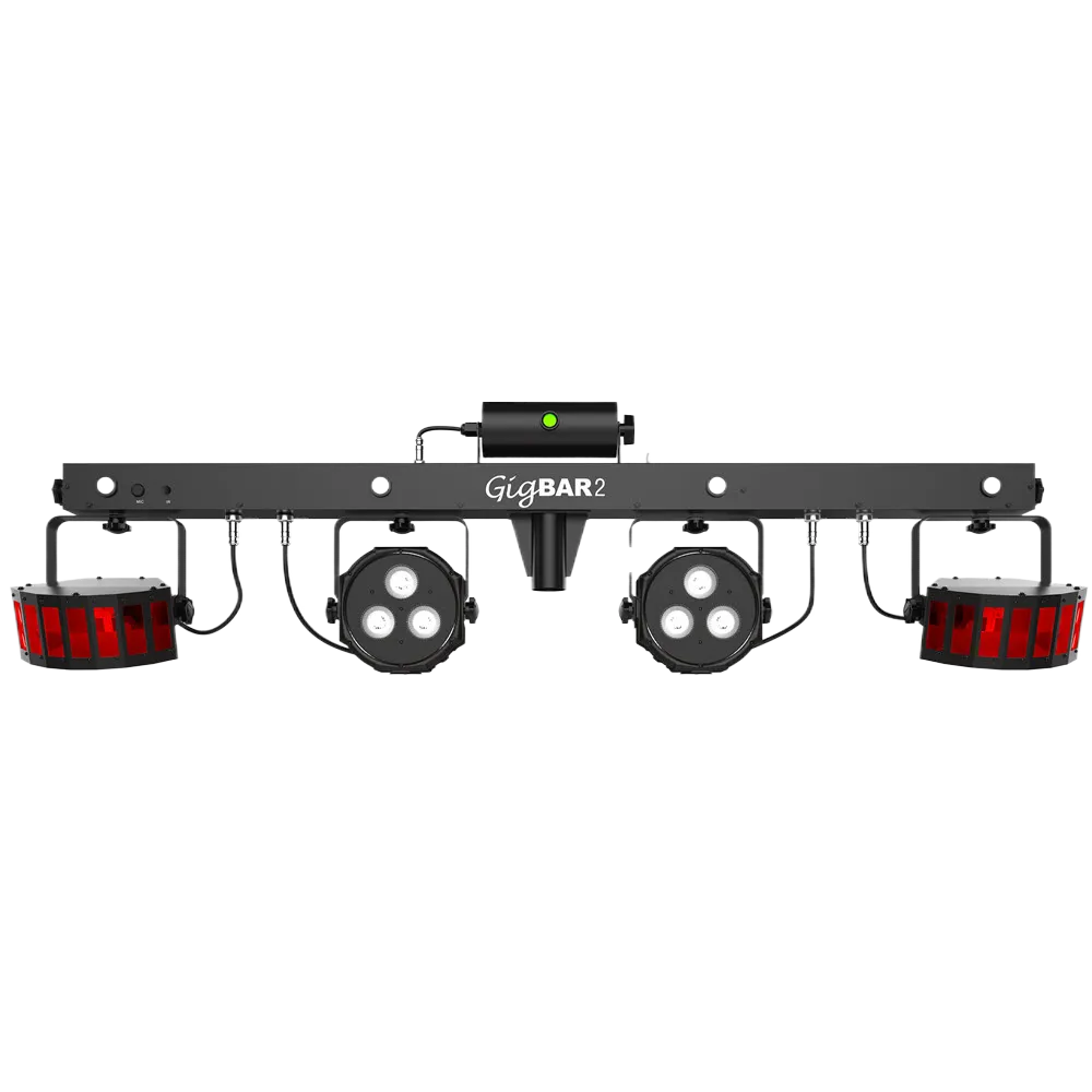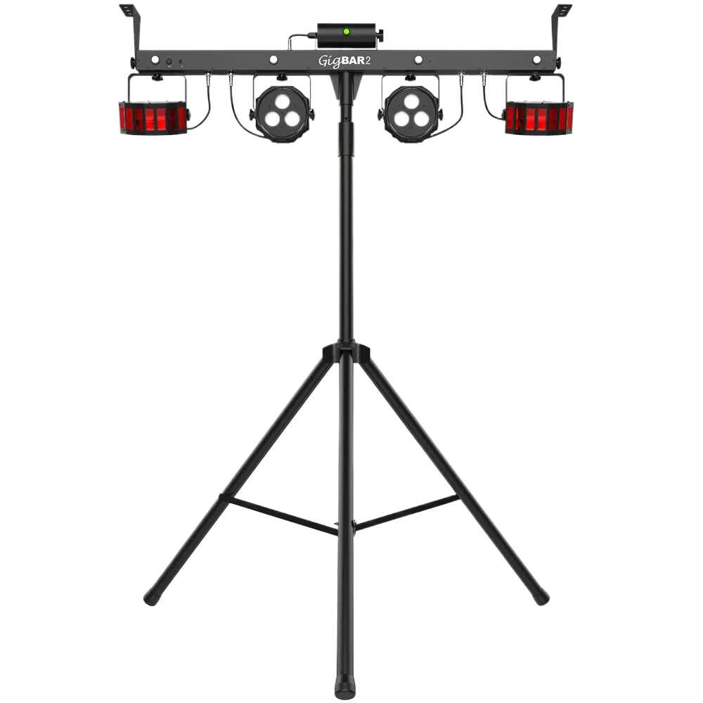 The Gigbar 2 is a 4-in-1 features a mix of LED derbies, pars, lasers, and strobe lights all mounted on a single bar to make setting up a breeze. Just attach the stand, plug in one cable, and you’re ready to go!